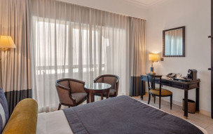 Superior Sea View pokoj - klimatizace, minibar, sejf, fén, telefon, SAT/TV, Wi-fi internet zdarma, koupelna, sprcha, WC, balkon, částečný výhled na moře. Možnost přistýlky nebo možnost ubytování až 2 dětí do 12 let.