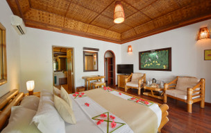 Superior beach bungalov (45 m2) - klimatizace, ventilátor, minibar, sejf, set na přípravu kávy a čaje, fén, telefon, LCD SAT/TV, Wi-fi internet zdarma, koupelna, sprcha, WC, balkon nebo terasa, sedací souprava, plážová lehátka se slunečníky. Možnost přistýlky.