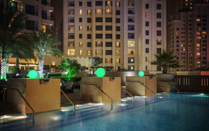 Jumeirah, vzdálenost od letiště cca 20 minut jízdy, cca 10 minut od World Trade Centre, ve vzrostlé zahradě s potůčky a vodopády, u vlastní písečné pláže a v blízkosti velkých nákupních center a cca 15 minut od vodního parku Wild Wadi.
