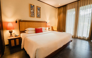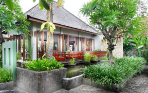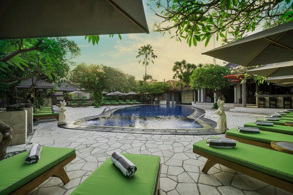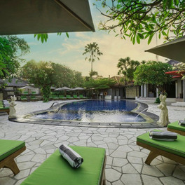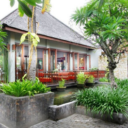 Kuta, v jižní části ostrova, v tropické zahradě, v těsné blízkosti písečné pláže Kuta Beach, známé pro výborné surfařské podmínky a pro své výhledy na západ slunce. V pěší vzdálenosti od městečka Kuta, které nabízí spoustu zábavních a nákupních možností. V blízkosti se nachází golfová hřiště. Vzdálenost od letiště cca 15 minut jízdy.