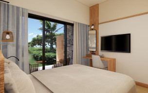 Novější resort s výhledem na úchvatnou tyrkysovou lagunu na straně jedné, a bujnou hornatou zelenou vegetaci na straně druhé!