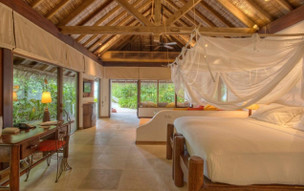 One Bedroom Soneva Fushi Family Villa Suite with Pool (360 m2) - dvoupatrová vila s verandou, klimatizace, ventilátor, minibar, sejf, fén, telefon, open air koupelna se zahradou, sprcha, WC, terasa, open air ložnice, open air obývací část, privátní bazén, plážová lehátka se slunečníky, SAT/TV, DVD přehrávač, Hi-Fi systém Bose, Wi-fi internet - jen na vlastní žádost, bicykly. Možnost přistýlky nebo možnost ubytování až 2 dětí - vhodná pro rodiny i s většími dětmi, má oddělenou místnost na spaní s vlastním příslušenstvím.